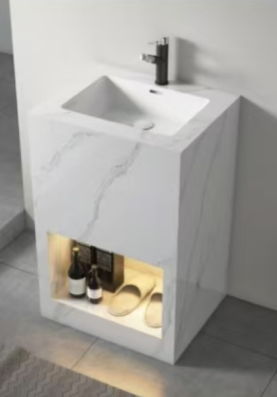Compacte mais audacieuse, la vanité Cube Élégance est parfaite pour les petits espaces ou les salles d’eau modernes. Sa structure en marbre blanc veiné apporte une touche raffinée, tandis que la niche lumineuse en bas ajoute une ambiance chaleureuse et pratique. Ce modèle monobloc optimise l’espace sans compromis sur le style.