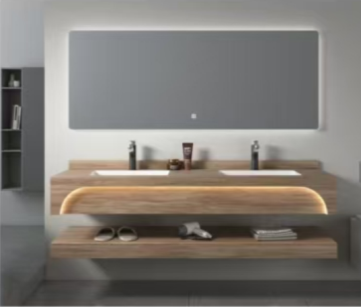 Avec ses lignes horizontales pures et son fini aspect bois naturel chaleureux, Linéa Duo est la vanité murale parfaite pour les couples ou les familles. Elle dispose de deux vasques intégrées, d’un éclairage LED doux intégré sous le rebord arrondi, et d’une tablette inférieure pour le rangement ouvert. Une pièce qui allie élégance, fonctionnalité et confort.