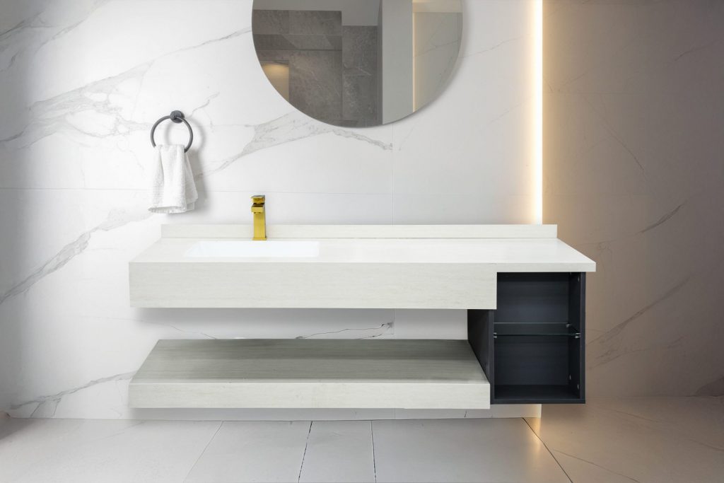 La vanité murale Nordik Beige incarne la douceur naturelle et la praticité moderne. Son fini beige clair effet pierre naturelle apporte une ambiance apaisante à votre salle de bain. Dotée d’une niche ouverte pour les serviettes et d’un rangement vertical latéral, elle combine design minimaliste et utilité au quotidien. Le miroir rectangulaire rétroéclairé complète son style épuré
